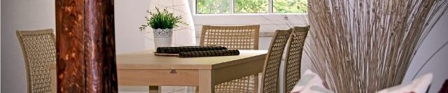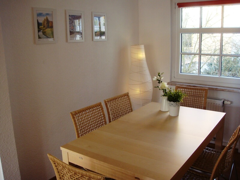 Auf der Gegenseite des Zimmers befindet sich der großzügige Essplatz mit bequemen Stühlen.