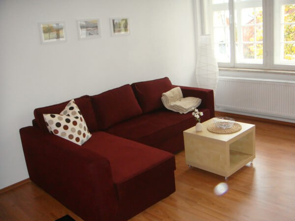 Helle Wände, kirschbaumfarbener Fußboden, moderne Möbel und Accessoires in rötlichen,orange und ockerfarbene Tönen geben den Räumen die besondere Note.