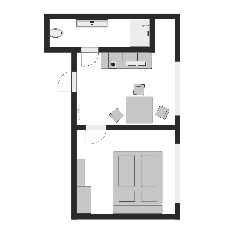The second room in the apartment provides you with a dining area with a dining table and comfortable chairs and as well as a kitchenette that offers hobs, sink, refrigerator, dishwasher, coffee maker, toaster, electric kettle and all necessary tableware.